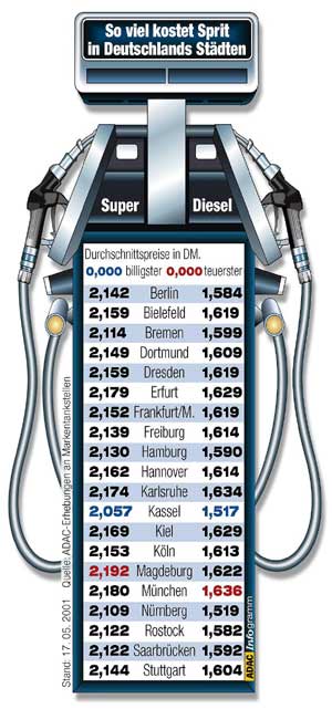 wo Super über 2,19 Mark kostet und Diesel immerhin über 1,62 Mark. München ist das traurige Schlusslicht in der