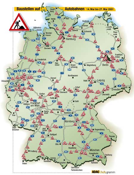 Die Grafik rechts zeigt die aktuellen Baustellen auf Autobahnen bis zum 27. Mai. Mit einem Klick auf das Bild