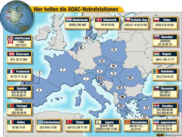 ADAC-Mitgliedern stehen im Ausland 20 Notrufstationen mit Rat und Tat zur Verfügung. Klicken Sie auf das