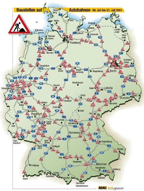 Die Grafik oben rechts zeigt die aktuellen Baustellen auf Autobahnen bis zum 23. Juli, das nebenstehende Infogramm die besonders staugefährdeten Bereiche am Wochenende. Mit einem Klick auf das jeweilige Bild gelangen