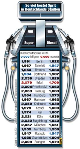 Superbenzin immerhin 14 Pfennig. Das ergibt die aktuelle Erhebung an Markentankstellen in 20 deutschen Städten.