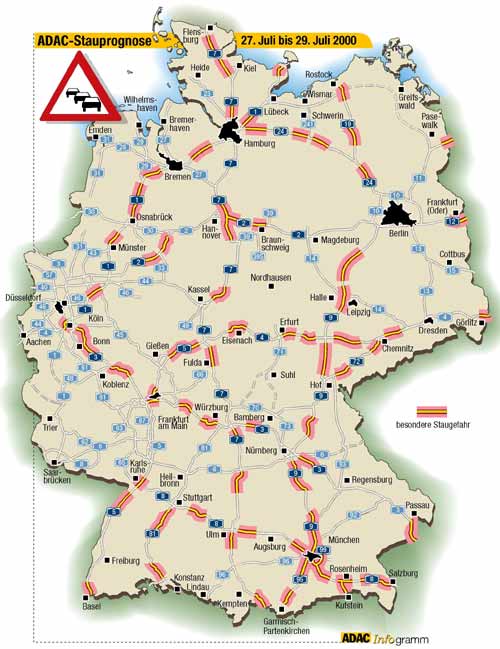 Auch an den Grenzübergängen nach Polen und Tschechien sowie von Österreich nach Ungarn, bei Chiasso und am Brenner wird man mit längeren Wartezeiten rechnen müssen. In Österreich erwartet der ADAC größere Verkehrsstörungen in Richtung Nord und Süd auf allen bedeutenden Ferienrouten, besonders auf der Tauernautobahn vor dem Tauern- und Katschberg-Tunnel, wo es erneut zu langen Staus kommen dürfte. In der Schweiz werden es erneut die Gotthard-Route und in Italien die Brennerstrecke sein, auf denen es sehr starkem Urlaubsverkehr geben wird. Wer nach und durch Frankreich muss, sollte dort vor allem samstags auf allen Autobahnen kilometerlange Staus einplanen, denn am letzten Juli-Wochenende brechen traditionell die meisten Franzosen in die Ferien auf.
