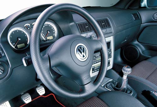 Ur-GTI: Lenkrad, Handbremshebel und Schalthebelmanschette erinnern mit gelochtem Leder und roter Naht an den GTI