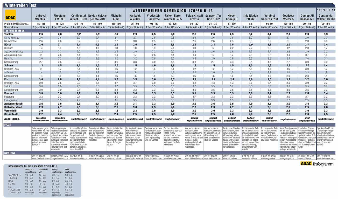 Die getesteten Reifen gehören zu drei unterschiedlichen Größenklassen. 15 Modelle haben die Dimension 175/65 R 13