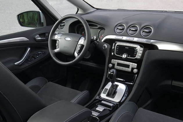 Blick ins S-MAX-Interieur: Neue Farben, neue Materialien, weniger silbernes Plastik. Neu im Angebot ist das Doppelkupplungsgetriebe, dessen Wählhebel aber »