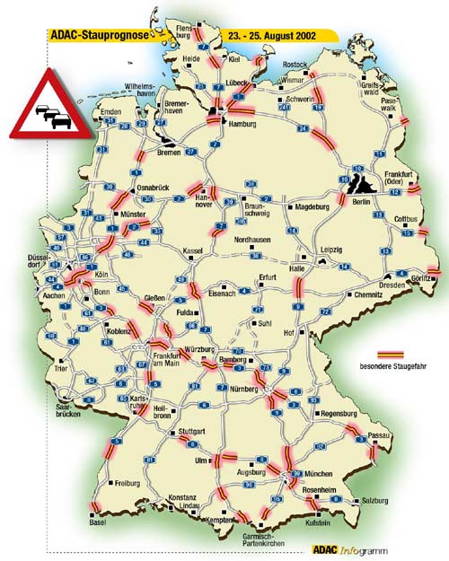 Großbild: Staubereiche auf Autobahnen am Wochenende 23.-25.08.2002